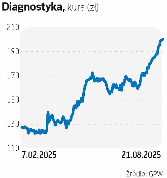 Diagnostyka zadebiutowała na GPW 7 lutego 2025 r. Akcje w ofercie publicznej cieszyły się bardzo dużym zainteresowaniem – w obu transzach. W detalicznej redukcja zapisów przekroczyła 94 proc. Na otwarciu pierwszej sesji kurs wzrósł ze 105 zł do 125,5 zł. Przez pierwsze tygodnie utrzymywał się na stosunkowo stabilnym poziomie, a potem zaczął dominować popyt, wspierany przez pozytywne rekomendacje. Kilka dni temu kurs przebił psychologiczną granicę 200 zł. Jest o 92 proc. wyższy od ceny akcji z IPO. Kapitalizacja spółki wynosi 6,8 mld zł.