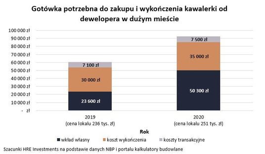 Ponad 90 tysięcy złotych – nawet tyle gotówki potrzebujemy, aby kupić na kredyt i wykończyć dziś kawalerkę od dewelopera. To o ponad 50 proc. więcej niż przed rokiem – wynika z danych HRE Investments.
