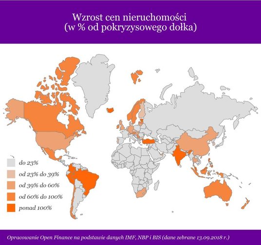 W większości krajów świata (40 na 57 badanych przez Bank Rozrachunków Międzynarodowych) ceny domów i mieszkań są dziś wyższe niż dekadę temu. To sugeruje, że w przynajmniej części z nich kolejne lata mogą przynieść poważne zawirowania i przeceny domów lub mieszkań. Spójrzmy na najbardziej jaskrawe przykłady bardzo dynamicznych wzrostów cen. Są aż trzy miejsca na świecie (Indie, Hongkong, Peru), w których ceny nieruchomości są dziś przynajmniej trzykrotnie wyższe niż w cenowym dołku, do którego doprowadził ostatni kryzys. Jest ponadto 8 krajów, w których nieruchomości podrożały od kryzysu o przynajmniej 100 proc. Są to Turcja, Brazylia, Kolumbia, Izrael, Filipiny, Malezja, Estonia czy Islandia.