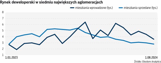 Sierpniowy wynik jest najsłabszy od stycznia 2023 r., czyli ostatniego miesiąca kredytowej zimy i obowiązywania dużego bufora na zmianę stóp przy badaniu zdolności kredytowej (poluzowano go miesiąc później). Sierpień był też ósmym miesiącem z rzędu, kiedy deweloperzy wprowadzali do oferty więcej mieszkań niż w tym czasie sprzedali, przy czym kurek z podażą został już wyraźnie przykręcony: ruszyła sprzedaż 3,6 tys. lokali, o 18 proc. mniej niż w lipcu i najmniej od sierpnia ub.r. Oferta na koniec sierpnia urosła do 52,4 tys. lokali wobec 38 tys. rok wcześniej.