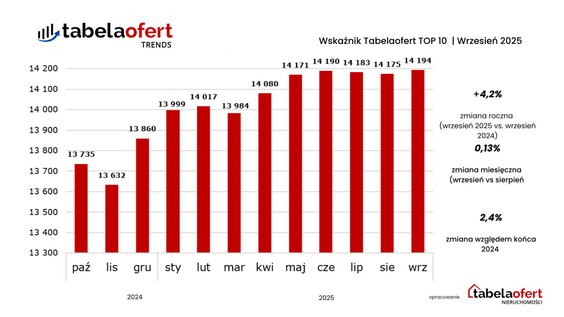 Barometr cen mieszkań publikuje serwis Tabelaofert.pl. Z analiz portalu wynika, że średnia cena metra kwadratowego typowego mieszkania w dziesięciu największych miastach w ciągu miesiąca praktycznie się nie zmieniła – to 14,2 tys. zł, co oznacza symboliczny wzrost o 0,13 proc.