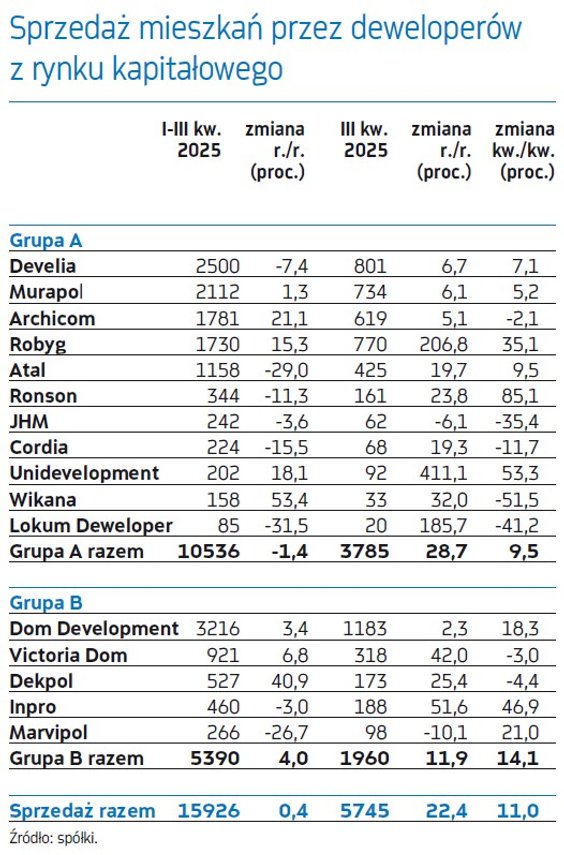 – Mając na uwadze ostatnie cięcia stopy bazowej oraz oczekiwane w 2026 r., niskie bezrobocie i spodziewany dalszy wzrost płacy realnej w polskiej gospodarce, jak również szerokie, zdywersyfikowane i prawidłowo dopasowane do obecnych oczekiwań klientów oferty wiodących graczy w branży notowanych na GPW, przy jednoczesnym odwrocie ze strony mniejszych podmiotów, spodziewam się obecnie wzrostu wolumenu mieszkań sprzedanych przez pięciu głównych deweloperów mieszkaniowych, których pokrywamy (Archicom, Atal, Develia, Dom Development, Murapol) o średnio 16 proc. w tym i o 22 proc. w przyszłym roku. W tym kontekście zakładam, że IV kwartał tego roku przyniesie kolejny wzrost sprzedaży kwartał do kwartału, choć warto zauważyć, że w wybranych przypadkach wypełnienie całorocznych celów może stanowić wyzwanie. Nieznaczne niedociągnięcie nie powinno jednak w szerszym kontekście stanowić istotnego czynnika zniechęcającego inwestorów – mówi Bernatek.