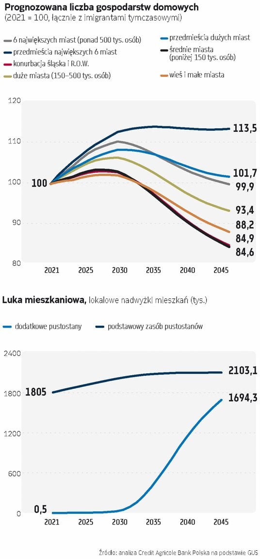 Zgodnie z analizą Credit Agricole, do okolic 2030 r., gdy przewidywany jest początek trendu spadkowego dla liczby gospodarstw domowych, popyt na mieszkania powinien pozostawać wysoki (acz zróżnicowany lokalnie w zależności od wielkości luki mieszkaniowej), a w ślad za nim – również aktywność w budownictwie.