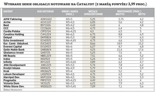 Zestawienie uwzględnia wszystkich emitentów z Catalyst, którzy płacą za obligacje więcej niż 3,99 pkt proc. ponad WIBOR, których obligacje zostały wystawione na sprzedaż w dniu pisania tekstu. Nie zawiera papierów, które spełniają kryteria oprocentowania, ale pozostają niedostępne (brak ofert sprzedaży). Jeśli dany emitent wprowadził do notowań więcej niż jedną serię o oprocentowaniu powyżej 3,99 pkt proc. ponad WIBOR, wybór padał na najdłuższą serię lub – jeśli akurat brakowało ofert sprzedaży – na krótszą, którą można było kupić, lecz nadal z marżą od 4 pkt proc. Rentowność obliczono na podstawie najlepszych ofert sprzedaży.