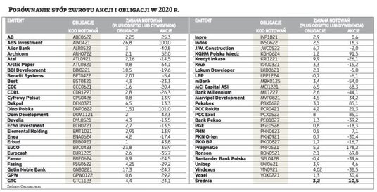 Średnia stopa zwrotu z akcji spółek notowanych także na Catalyst wyniosła w 2020 r. 10,5 proc. wobec 8,6 proc. w 2019 r. Natomiast średnia stopa zwrotu z obligacji tych samych emitentów wyniosła w tym czasie 3,2 proc. wobec 4,8 proc. rok wcześniej. Lecz w tym miejscu słowo wyjaśnienia – tym razem w obliczeniach uwzględniono najbliższą zapadającą serię obligacji (przed rokiem oprocentowanie z ostatniej emisji) oraz wpływ zmiany notowań obligacji na stopę zwrotu, natomiast nie uwzględniono wyższego – w I kwartale – WIBOR-u i przez to także oprocentowania obligacji. Gdyby pominąć zmiany notowań (najczęściej niekorzystne, stąd ujemne stopy zwrotu z obligacji w jednostkowych przypadkach) i uwzględnić wyższe oprocentowanie, średni zysk z obligacji przekroczyłby 4 proc.