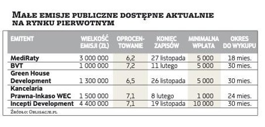Aktualnie trwają zapisy w ramach czterech tzw. małych emisji publicznych, a zapisy kolejnej z nich, prowadzonej równolegle, zakończyły się w miniony czwartek. Łączna wartość przeprowadzanych ofert to 11,2 mln zł, a więc w praktyce tyle, ile mogłaby wynosić wartość jednej tzw. małej emisji publicznej przeprowadzanej na podstawie memorandum informacyjnego (limit to równowartość 2,5 mln euro, przy kursie 4,48 zł jest to akurat 11,2 mln zł). Emitenci wykorzystują jednak inną możliwość – przeprowadzając emisje o równowartości do 1 mln euro, nie trzeba nawet sporządzać memorandum ani też zatrudniać firmy inwestycyjnej pośredniczącej w przyjmowaniu zapisów (niemniej kilka z nich z usług takiej firmy korzysta). Dlatego wartość żadnej z pięciu przedstawionych obok emisji nie przekracza 4,5 mln zł. Ba. Kancelaria Prawna-Inkaso WEC i BVT korzystały już w tym roku z możliwości przeprowadzenia małej emisji publicznej o wartości do 1 mln euro, ale zsumowanie pierwszych i ponowionych ofert wciąż nie daje równowartości 1 mln euro.