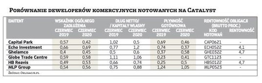 Niewiele można natomiast powiedzieć o tym, jak posiadacze obligacji postrzegają zmianę ryzyka w przypadku deweloperów komercyjnych, ponieważ ich papiery są przeważnie niepłynne (Capital Park, GTC i MLP wyemitowały obligacje w EUR). Tam, gdzie wyceny się pojawiają, o zaniepokojeniu nie ma mowy. Papiery Echa – jak dawniej – dzięki mieszkaniowej części biznesu, wyceniane z niższą rentownością niż Ghelamco i HB Reavis.