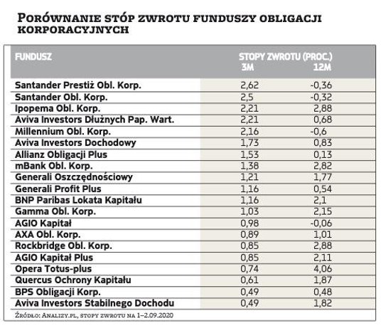 Tajemnica tkwi w składzie portfeli poszczególnych funduszy. Najlepszy w naszym zestawieniu Santander Prestiż zanotował wprawdzie spadek średniego ważonego oprocentowania części korporacyjnej z 3,66 proc. do 3,25 proc. między grudniem 2019 r. i czerwcem 2020 r., ale obligacje oparte o WIBOR stanowiły w jego przypadku 34,5 proc. aktywów (na koniec czerwca; na koniec grudnia było to 26,8 proc.). 42,9 proc. portfela fundusz ulokował wprawdzie w obligacjach klasyfikowanych jako korporacyjne, ale były to papiery zagranicznych emitentów. W ich przypadku wpływ spadku WIBOR na oprocentowanie jest oczywiście nieistotny, a znacznie większe znaczenie mają bieżące notowania – zagraniczne papiery przynajmniej w części notowane są na płynnych rynkach obligacji. Co prawda wyceny te poddały się w marcu znaczącej przecenie, ale w II kwartale ich notowania systematycznie rosły i trend ten był kontynuowany w wakacje. Dość wspomnieć, że efektywna rentowność papierów high yield spadła w USA do 5,3 proc., z 11,4 proc. pod koniec marca, i jest w zasadzie równie nisko, co przed pandemią. Przecena wywołana Covid okazała się niczym więcej niż okazją do zakupów przecenionych w panice aktywów.