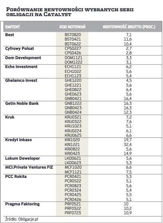 Wyraźną różnicę w poziomie rentowności widać tylko między papierami wygasającymi w 2020 r. (a więc w perspektywie kilku miesięcy) i pozostałymi seriami. Te zapadające w najbliższym czasie wyceniane są na ogół najbliżej wartości nominalnych – w ich przypadku ryzyko zostało już oszacowane i uznane za mniejsze niż dłuższych papierów, choć nadal oferują przy tym kuszące – z perspektywy sprzed pandemii – rentowności. Obligacje zapadające w 2021 roku wyceniane są niżej, rentowność jest wyższa, ale w dalszej perspektywie przeważnie już nie rośnie (są od tego wyjątki) lub rośnie nieznacznie, ale po to, by w przypadku serii zapadających w kolejnych latach (2022 r.) zacząć maleć. W zasadzie jedynym przykładem emitenta, w przypadku którego krzywa rentowności rośnie, jest Pragma Faktoring, a drugim Cyfrowy Polsat, gdzie różnica dziesięciu miesięcy w terminie wykupu przekłada się na dziesięć punktów bazowych rentowności, czyli w obecnych warunkach jest właściwie pomijalna.