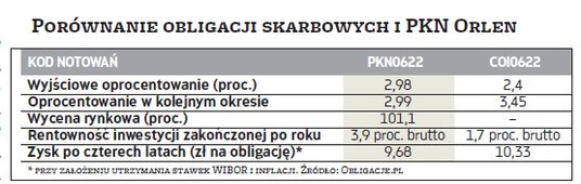 Równolegle w czerwcu ub.r. PKN Orlen przeprowadził dwie publiczne emisje obligacji (i jedną w maju) – każda o wartości 200 mln zł. Za czteroletnie obligacje koncern zaoferował 1,2 pkt proc. ponad WIBOR 6M. Od tego czasu stawka WIBOR także wzrosła, ale o zaledwie 1 pkt baz. (do 1,79 proc.). Analizując atrakcyjność publicznych emisji Orlenu, spekulowaliśmy w „Parkiecie", że inwestycja w czteroletnie papiery skarbowe może dać lepsze efekty niż udział w emisji Orlenu przy jednocześnie niższym ryzyku inwestycji wynikającym choćby z niższego ratingu obligacji Orlenu (BBB- wobec oceny A- dla Skarbu Państwa). Po upływie roku warto sprawdzić, ile warte były te przewidywania.