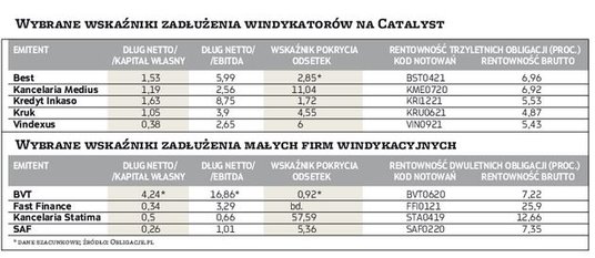 Sytuacja każdego z wymienionych windykatorów jest nieco inna. Najjaśniejszą gwiazdą jest Kruk, który może pochwalić się największą liczbą funduszy inwestycyjnych, które posiadały jego obligacje na koniec roku (93), otwartymi liniami kredytowymi i zasobami gotówki. W jego przypadku wydanie nawet 1 mld zł bez sięgania po kolejne emisje wydaje się możliwym scenariuszem. Best i Kancelaria Medius (tu ofert publicznych nigdy nie było) udowodniły, że refinansowanie obligacji nie jest im potrzebne do życia, nowe środki potrzebne są natomiast do zwiększenia inwestycji (KME wychodzi jednak na nowe rynki, których potencjał nie jest jeszcze dokładnie rozpoznany). Best od dłuższego czasu nie ma wsparcia funduszy inwestycyjnych i polega na emisjach publicznych oraz – w coraz większym stopniu – na finansowaniu bankowym, podczas gdy KME ma jednego partnera (Trigon TFI jest wiodącym akcjonariuszem i zapewnia także finansowanie dłużne). Z kolei Kredyt Inkaso zaczął nowe życie po przejęciu przez WaterLand i do niedawna refinansowanie obligacji wśród TFI było sposobem spółki na spłatę zapadającego długu, ale teraz jest na drodze, by osiągnąć status rywali. Vindexus prowadzi zaś najbardziej ostrożną politykę zadłużania i osiąga dzięki temu najlepsze wskaźniki zdolności do jego obsługi, choć za cenę wolniejszego rozwoju.