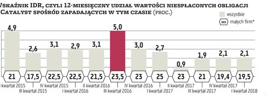 Mimo pędzącej polskiej gospodarki nie brakuje u nas firm mających problemy. W 2017 r. sądy ogłosiły upadłość 889 firm, co oznacza wzrost przez rok o 15 proc. – wynika z danych Bisnode. Eksperci prognozują na podstawie danych ze stycznia i lutego, że w tym roku liczba upadłości będzie jeszcze wyższa i prawdopodobnie przekroczy tysiąc, co oznaczać będzie wzrost o co najmniej 12 proc. Problemy firm przekładają się na ich wierzycieli, czyli także obligatariuszy.