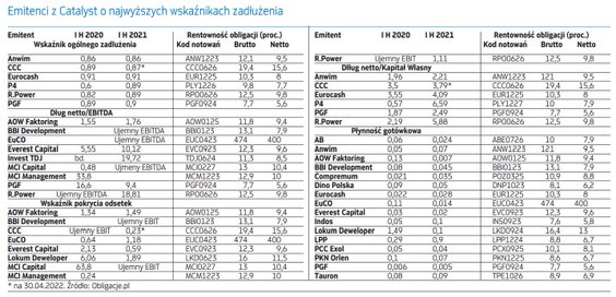 W prezentowanej tabeli zebraliśmy emitentów obligacji o najwyższych wskaźnikach zadłużenia w różnych kategoriach wskaźników, ale wyciąganie wniosków na podstawie samej tylko obecności w zestawieniu byłoby zdecydowanie przedwczesne. Część firm „zawsze” utrzymuje wysoki poziom zadłużenia ogólnego, ponieważ taka jest po prostu specyfika np. firm handlowych, takich jak PGF czy Eurocash, a niewiele niższe wskaźniki notuje zwykle branża budowlana. Jeśli towar rotuje kilkukrotnie w ciągu kwartału, to trzymanie zasobów gotówkowych jest kosztem. Również działanie na niskich marżach operacyjnych (czyli takich jak w handlu hurtowym i w budowlance) wymaga korzystania z wysokiej dźwigni operacyjnej. Praca na samym kapitale własnym dałaby zyski niższe niż oprocentowanie wkładów pieniężnych. Mówiąc krótko – byłaby nieefektywna.
