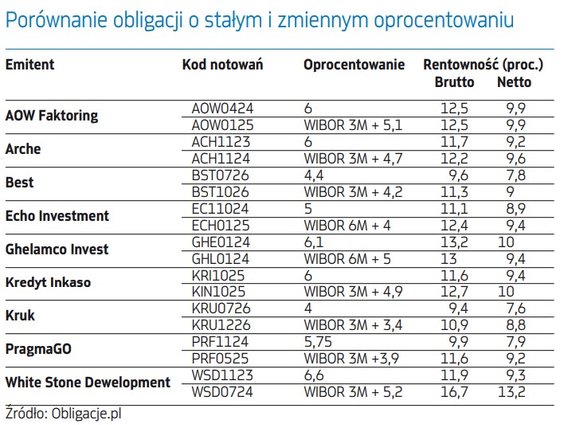 W tabelce obok zebraliśmy obligacje firm, które oferowały w przeszłości (zwykle w okolicach 2020 r.) papiery o stałym oprocentowaniu i – dla porównania – obligacje o zmiennym kuponie o możliwie zbliżonym (ale późniejszym) terminie wykupu. Takie porównanie pozwala stwierdzić, że to obligacje o zmiennym oprocentowaniu oferują obecnie wyższą rentowność, co z kolei prowadziłoby do wniosku, że papiery o stałym oprocentowaniu zdążyły już zdyskontować scenariusz przyszłych, ale niezbyt odległych, obniżek stóp procentowych. Byłby to jednak wniosek niezupełnie prawdziwy.