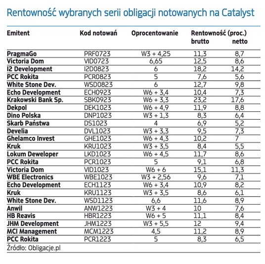 Dla przypomnienia – analogiczne porównanie przeprowadziliśmy przed rokiem. Wówczas rentowność obligacji firm zapadających w drugiej połowie 2022 r. wynosiła 3–5 proc. (tylko najodważniejsi analitycy zakładali wówczas, że główna stopa procentowa może przekroczyć 4 proc.). Obecnie jest to najczęściej 9–12 proc. (pomijając skrajne przypadki oraz te, dla których brak zleceń sprzedaży w karnecie) brutto, ale przed rokiem oprocentowanie lokat bankowych wciąż unosiło się o włos nad poziomem 0 proc., a dwuletnie obligacje oszczędnościowe oferowały 1 proc. odsetek. Przewagą obligacji korporacyjnych było także oparcie oprocentowania o stawki WIBOR – wiadomo było, że jeśli wzrost stóp procentowych przekroczy oczekiwania ekonomistów, znajdzie to swoje odzwierciedlenie w wysokości naliczanych kuponów.