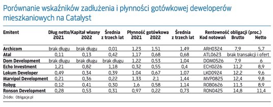Całkiem nieźle, biorąc pod uwagę okoliczności. Branża korzystała z nieprzeciętnie udanego 2021 r. i podpisanych wówczas umów sprzedaży. Realizacja rozpoczętych wcześniej inwestycji zapewniła deweloperom zastrzyki płynności operacyjnej, a jednocześnie wielu z nich ograniczyło zakupy gruntów oraz uruchamianie nowych inwestycji. Wobec tego pozyskiwane środki mogły być przeznaczane na obsługę i spłatę zadłużenia, a czasem także na przyspieszenie spłaty zapadających obligacji, których oprocentowanie opiera się na stawkach WIBOR i zazwyczaj wyraźnie przekracza 10 proc. Przy spadającej rentowności operacyjnej (koszty budowy mieszkań wzrosły, ale możliwości przenoszenia wyższych kosztów na klientów były i nadal są ograniczone) rosnące koszty odsetkowe miały coraz większy wpływ na wyniki brutto i netto. Z reguły nie jest to wiadomość przyjemna dla akcjonariuszy, ale właściciele obligacji mają prawo czuć się komfortowo.