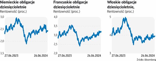 Rentowność francuskich dziesięciolatek wynosiła w środę po południu 3,17 proc., podczas gdy dochodowość ich niemieckich odpowiedników sięgała 2,45 proc. W pierwszym tygodniu czerwca różnica między nimi, czyli tzw. spread, była zbliżona do 50 pkt baz., w kolejnym zaś tygodniu (po ogłoszeniu przyspieszonych wyborów parlamentarnych we Francji) przekraczała już 80 pkt baz. Na początku roku rentowność niemieckich obligacji dziesięcioletnich wynosiła dla porównania 2,36 proc., a francuskich – 2,92 proc.