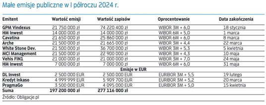 Nie jest ich za to tak wiele, jak zdarzało się w ubiegłych latach. W tym roku emitenci zdecydowali się na przeprowadzenie 11 tzw. małych emisji publicznych. Wspólną cechą tych ofert jest szeroka dystrybucja. W przypadku tego typu emisji oferujący mogą zbierać zapisy od szerokiego grona nabywców, reklamować emisję w mediach i na własnych stronach internetowych, dokumenty zaś emisyjne nie muszą zostać zatwierdzone przez Komisję Nadzoru Finansowego. Ceną za te przywileje jest rozmiar emisji – nie może być on większy niż równowartość 5 mln euro w przypadku jednej lub nawet kilku emisji przeprowadzonych w terminie 12 miesięcy.