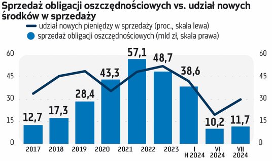 Pozyskiwanie nowych środków z emisji obligacji oszczędnościowych idzie więc znacznie wolniej, niż wskazywałyby na to same wyniki sprzedażowe. W czerwcu „nowe pieniądze” stanowiły niecałe 20 proc. raportowanej sprzedaży, w lipcu było z tym nieco lepiej (prawie 30 proc.), ale wciąż poniżej średniej z ostatnich lat, gdy nowe pieniądze stanowiły od 34 proc. (2018 r.) do 52,4 proc. (2023 r.) raportowanej sprzedaży.