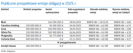 W 2025 r. sześciu emitentów wchodzi z ważnymi prospektami emisyjnymi, na podstawie których mogą przeprowadzić kolejne szeroko dostępne oferty obligacji. Samych emisji więc nie zabraknie, przynajmniej w pierwszych miesiącach roku. Im dalej w rok, tym liczba emisji będzie się kurczyć, nie ma co liczyć na powtórzenie statystyk z 2024 r., kiedy 14 emitentów przeprowadziło 33 tego rodzaju emisje.