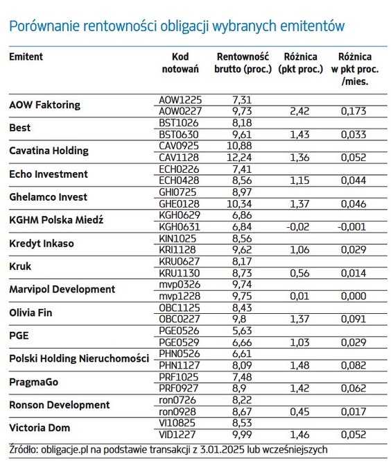 Po stworzeniu grupy porównawczej uzyskaliśmy wyniki prezentowane w tabeli obok. Średnia różnica w rentownościach przeliczona na miesiące okazała się zaskakująco wysoka i wyniosła 0,048 pkt proc. (mediana 0,044 pkt proc.), co daje aż 57 pkt baz. rocznie. Warto przy tym pamiętać, że premia naliczana jest nie tylko za wydłużenie okresu inwestycji, ale także za kolejność do wykupu. Dobrym przykładem może być Best, który w 2025 r. nie musi wykupić żadnych obligacji, a do października 2026 r. tylko dwie serie warte łącznie niecałych 21 mln zł. Biorąc pod uwagę, że Best pozyskuje, lekko licząc, 100 mln zł kwartalnie spłat, wykup obligacji zapadających w 2026 r. jest formalnością. Ale im dłuższy termin, tym więcej też długu do wykupienia po drodze (łącznie notowanych jest 16 serii). Z tego względu można przyjąć, że pierwsze serie w kolejności do wykupu rynek traktuje ze szczególnymi względami (np. najbliższe papiery Kruka wyceniane są na 3,6 proc. rentowności brutto), ale już różnica między np. dziesiątą i jedenastą serią w kolejce nie będzie tak istotna. I rzeczywiście. Piętnasta i szesnasta seria obligacji Bestu wyceniana jest z identyczną rentownością, choć dzieli je pół roku różnicy w terminie wykupu. Między dwiema najdłuższymi seriami Kruka jest 13 miesięcy różnicy w terminie zapadalności, ale i 15 pkt baz. w rentowności.