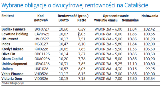 Ostatecznie więc z ponad 70 proc. emitentów tylko jedenastu ma jeszcze papiery o dwucyfrowej rentowności. Ich właśnie przedstawiamy w tabelce obok, przy czym jeśli dany emitent wprowadził do notowań więcej serii, które uzyskują obecnie rentowność powyżej 10 proc., wybór padał na najkrótsze papiery, ponieważ ryzyko kredytowe z nimi związane jest najniższe. Również ryzyko związane ze spadkiem stawek WIBOR-u po domniemanych obniżkach stóp procentowych w najmniejszym stopniu wpłynie na papiery o krótszych terminach zapadalności. Wyjątkiem są papiery, o których wiadomo, że zostaną wkrótce w całości lub części wykupione przed terminem.