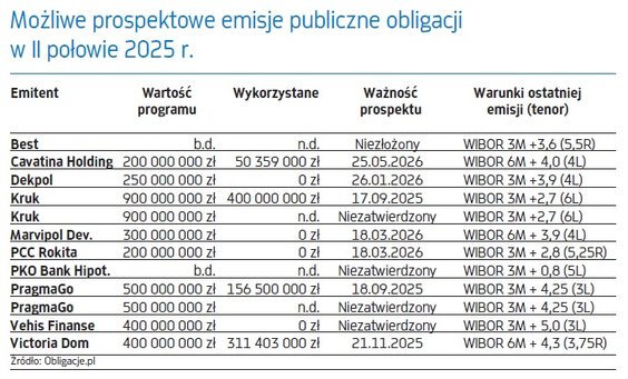 Średnią wartość oferty w górę będą ciągnąć emisje PKO Banku Hipotecznego. Nie wiadomo o nich zbyt wiele, poza tym, że pod koniec maja PKO BH złożył prospekt emisyjny. Ale po graczu tego kalibru (w czerwcu PKO BH uplasował listy warte 500 mln EUR, w lutym było to 800 mln zł), należy spodziewać się odpowiedniego rozmachu. Oczywiście istnieje niepewność, co do tego, jak inwestorzy indywidualni podejdą do bezpiecznych, lecz relatywnie nisko oprocentowanych papierów. Skoro jednak miesiąc w miesiąc kupują oni – za pośrednictwem PKO BP – obligacje oszczędnościowe za kilka miliardów złotych, można oczekiwać, że na listy zastawne zerkną przynajmniej z ciekawością.