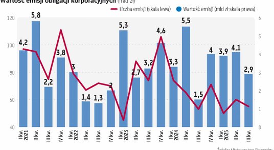 W III kwartale emitenci przeprowadzili 55 emisji obligacji (mowa o emisjach na rynku krajowym, z wyłączeniem papierów przedsiębiorstw finansowych takich jak bankowe grupy kapitałowe czy ubezpieczyciele) wartych łącznie 2,9 mld zł. Wartość emisji spadła w porównaniu do trzech wcześniejszych kwartałów, gdy oscylowała wokół kwoty 4,0 mld zł, ale okazała się znacznie wyższa niż w III kwartale ub.r., gdy na 53 emisje przypadło 1,5 mld zł.
