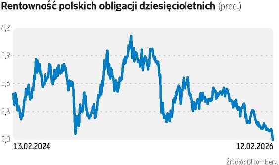Po raz pierwszy od ponad dwóch lat oprocentowanie polskich papierów dziesięcioletnich spadło poniżej okrągłego poziomu 5 proc. Niewiele brakuje, by dochodowość obligacji dziesięcioletnich stała się najniższa od blisko czterech lat. Na gwałtowne spadki dochodowości (wzrosty cen papierów skarbowych) raczej nie ma co liczyć w kolejnych latach, ale to wcale nie jest zła wiadomość dla inwestorów – oprocentowanie papierów skarbowych pozostaje na dość atrakcyjnych poziomach, dając obecnie ciekawą alternatywę dla akcji. Sytuacja krajowego rynku długu wydaje się być lepsza niż można było sądzić np. pół roku temu, gdy były spore obawy o kondycję budżetu w 2026 r. Nastroje na globalnych rynkach długu będą oczywiście w dużej mierze zależeć od zachowania papierów amerykańskich. Za oceanem oczekiwania względem polityki monetarnej w ostatnim czasie nie są stabilne.