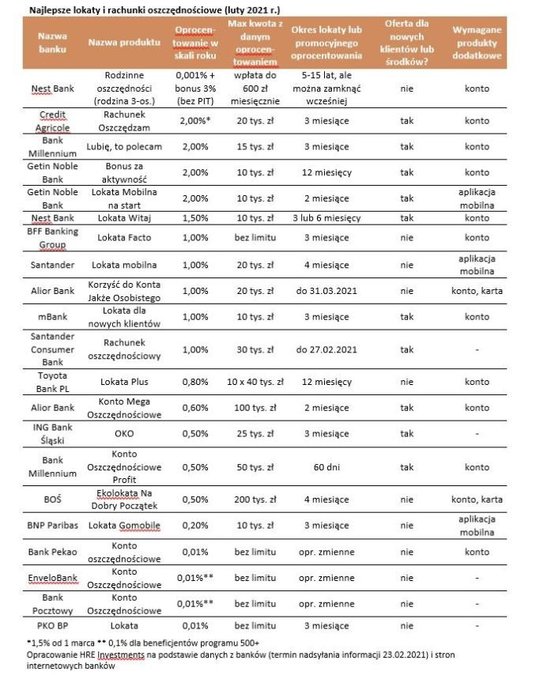 Lutowe zestawienie najlepszych lokat i rachunków oszczędnościowych, sporządzone przez HRE Investments, pokazuje, że już tylko w 5 instytucjach oszczędzający mogą zarobić 2-3 proc. w skali roku (przypomnijmy, że inflacja przekracza 3 proc.). Grono to zmniejszyło się po tym jak Nest Bank obciął oprocentowanie lokaty dla nowych klientów. Już dziś wiemy, że z grona tego wypadnie też niedługo Credit Agricole.