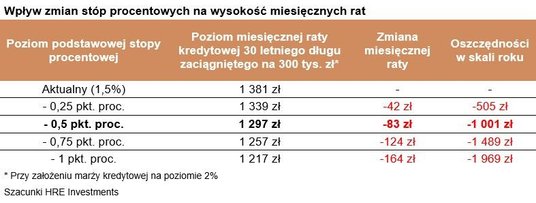 Dla złotowych posiadaczy kredytów, głównie hipotek, obniżenie podstawowej stopy procentowej o 0,5 pkt. proc. oznacza spadek przeciętnej raty kredytu o kilkadziesiąt złotych miesięcznie. Weźmy pod uwagę konkretny przykład – załóżmy, że kredytobiorca pożyczył 300 tysięcy złotych w ramach 30-letniego kredytu z marżą 2 proc. W takim przypadku cięcie stopy procentowej o 0,5 pkt. proc. oznacza spadek miesięcznej raty z obecnych 1381 złotych do 1297 złotych. Miesięcznie daje to oszczędność rzędu 83 złotych (1 tys. złotych w skali roku).