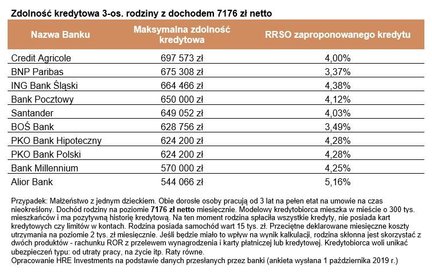 - Wspomniane 638,9 tysięcy złotych to mediana maksymalnej zdolności kredytowej. W praktyce oznacza to, że połowa banków skłonna byłaby rodzinie z naszego przykładu pożyczyć więcej, a połowa mniej - Bartosz Turek, główny analityk HRE Investments. Na najmniejszy kredyt można byłoby liczyć korzystając z oferty Alior Banku, choć i tu rodzina mogłaby pożyczyć całkiem pokaźną kwotę – 544 tys. zł . Najwięcej zaproponowałby za to Credit Agricole – bez mała 700 tys. zł. Z deklaracji banków wynika ponadto, że na najtańszą ofertę (najniższe RRSO) modelowa rodzina mogłaby liczyć w BNP Paribas i BOŚ Banku, choć trzeba mieć świadomość, że oferta może bardzo różnić się gdy po kredyt przyjdzie osoba wymykająca się z charakterystyki opisanej w naszym przykładzie.