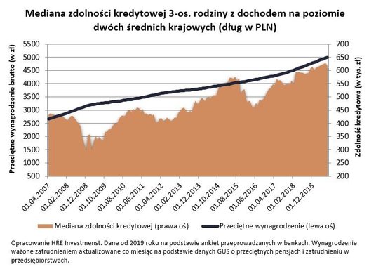 - Ten ostatni wzrost to zasługa rosnących wynagrodzeń Polaków. Biorąc pod uwagę dane o wynagrodzeniach i zatrudnieniu w przedsiębiorstwach za ostatnie 12 miesięcy, można oszacować, że pojedyncza średnia krajowa opiewa na 3515 zł netto. To znaczy, że modelowa familia może pochwalić się dochodem na poziomie 7030 zł miesięcznie. Takie zarobki są wystarczające, aby skutecznie ubiegać się o kredyt – mówi Bartosz Turek, główny analityk HRE Investments. O ile oczywiście nie przytłaczają nas zobowiązania, posiadamy pieniądze na wkład własny i pokrycie kosztów transakcyjnych oraz nie mamy złej historii kredytowej. Innym ważnym czynnikiem sprzyjającym zdolności kredytowej są utrzymujące się od marca 2015 r. historycznie niskie stopy procentowe.