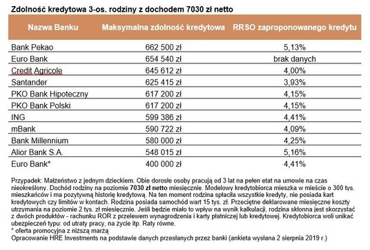 Wspomniane 617 tys. zł to mediana maksymalnej zdolności kredytowej. W praktyce oznacza to, że połowa banków skłonna byłaby rodzinie z naszego przykładu pożyczyć więcej, a połowa mniej. Na najmniejszy kredyt można byłoby liczyć korzystając z promocyjnej oferty z obniżoną marżą w Euro Banku. Decydując się na tańszy kredyt rodzina mogłaby tam pożyczyć na mieszkanie 400 tys. zł. Na standardowych warunkach (marża o 0,2 pkt. proc. wyższa) bank pożyczyłby prawie 655 tys. zł. Trochę więcej zaproponowałby tylko Pekao - prawie 663 tys. zł. Z deklaracji banków wynika ponadto, że na najtańszą ofertę (najniższe RRSO) modelowa rodzina mogłaby liczyć w Santanderze, Credit Agricole i mBanku.