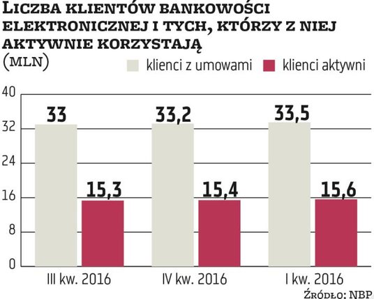 Na koniec marca na rynku było nieco ponad 33,5 mln umów bankowości internetowej – o 1 proc. więcej niż na koniec 2016 r. i o 8,72 proc. więcej niż w tym samym okresie roku ubiegłego. Stosunkowo większa dynamika wzrostu w ujęciu kwartalnym wystąpiła wśród klientów aktywnie korzystających z bankowości internetowej. Od stycznia do marca przynajmniej raz w miesiącu na swoim koncie w banku zalogowało się 15,6 mln klientów. To o 1,7 proc. więcej w stosunku do poprzedniego kwartału i o 5 proc. w stosunku do końca marca 2016 r. W ujęciu bezwzględnym to kwartalny przyrost na poziomie 284 tys. aktywnych użytkowników.