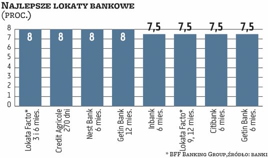 Natomiast najwyższe odsetki można otrzymać w bankach prywatnych. Lokata Facto oferowana przez BFF Banking Goup to obecnie 8 proc. na 3 i 6 miesięcy, 7,5 proc. na 3 i 6 miesięcy. Górnej granicy lokaty brak. Getin Bank proponuje 8 proc. na 12-miesięcznej lokacie, 6-miesięczna daje 7,5 proc. Można na nie wpłacić do 180 tys. zł, ale klient ma możliwość założenia pięciu lokat o tym samym okresie umownym. Ostateczny czas złożenia wniosku o lokatę to 29 września – środki na nią będzie można wpłacić w ciągu 7 dni od złożenia wniosku. Bank Credit Agricole ma promocję Lokaty mobilnej na dobry początek z oprocentowaniem w wysokości 8 proc. Można na nią wpłacić do 75 tys. zł na 270 dni.