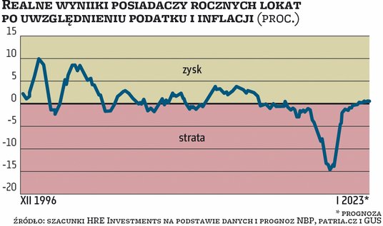 Osoby, które złożyły pieniądze na lokatach bankowych (a tych pieniędzy jest coraz więcej), przyzwyczaiły się już zapewne do tego, że główną zaletą trzymania środków w banku jest bezpieczeństwo. Od ośmiu lat bowiem te pieniądze przynoszą realne straty. Jak wyliczyli analitycy HRE Investments, w przypadku bankowych depozytów z najgorszym wynikiem mieliśmy do czynienia z w październiku 2022 r. Wtedy ogłoszona przez GUS inflacja wynosiła 17,9 proc. Za to lokaty zakładane rok wcześniej były przeciętnie oprocentowane na zaledwie 0,24 proc. – wynika z danych NBP. – Ci, którym przeciętne roczne lokaty kończyły się w kwietniu 2023 r., realnie stracili około 11 proc. – podają Bartosz Turek i Oskar Sękowski z HRE Investments.