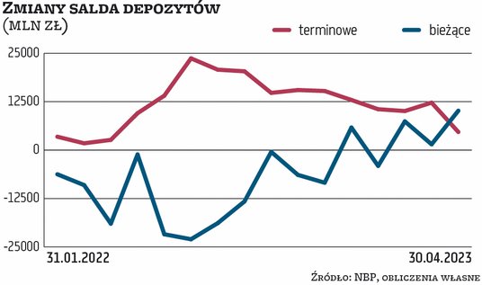 W kwietniu depozyty bieżące wzrosły o niemal 10,2 mld zł, a terminowe „tylko” o niecałe 4,7 mld zł. Po wielu miesiącach z ujemnym saldem tych pierwszych i wysoką dynamiką lokat sytuacja zaczyna wracać do tej sprzed tąpnięcia na początku 2022 roku. Wtedy pieniądze zaczęły wypływać z kont. Lokaty zaczęły się cieszyć rosnącym zainteresowaniem już od września 2021 r., tuż przed początkiem cyklu podwyżek stóp procentowych NBP. Efekt był taki, że cały ubiegły rok zamknął się ujemnym saldem depozytów bieżących w wysokości 121,7 mld zł i dodatnim terminowych – 154,7 mld zł. W tym roku nadal widać przewagę lokat – do kwietnia wzrosły o prawie 37,6 mld zł – ale bieżące już nie maleją: na koniec kwietnia były o 15 mld zł większe niż na koniec ub.r.