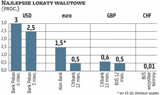 Getin Bank długi czas był również liderem w przypadku dolarów – jego półroczna Lokata Powitalna oprocentowana była na 2,2 proc., potem oprocentowanie obniżono najpierw do 2 proc., później do 1,5 proc., do 1,3 proc., aż wreszcie znikła z oferty. W maju 2020 r. bank oferował 12-miesięczną lokatę z oprocentowaniem 0,85 proc., potem 0,6 proc. U jego następcy, Velobanku, oprocentowanie wynosi od 0,3 do 0,5 proc. Lider z 2020 r., Credit Agricole, długo nie zmieniał oprocentowania swojej trzyletniej lokaty – 1 proc., potem miał ją (wraz z dwuletnią) na poziomie 0,3 proc. Obecnie lokaty we wszystkich walutach oprocentowane są w CA na równym poziomie – 0,01 proc. W BOŚ Bank oprocentowanie 12-miesięcznej lokaty wynosiło 0,5 proc., dość długo dając pierwsze miejsce. Teraz liderem jest Bank Pekao, z sześciomiesięczną lokatą oprocentowaną na 3 proc. I ma jeszcze lokatę trzymiesięczną z oprocentowaniem 2,5 proc. Oferta obowiązuje tylko do końca września – ale wcześniej miała się skończyć w czerwcu.