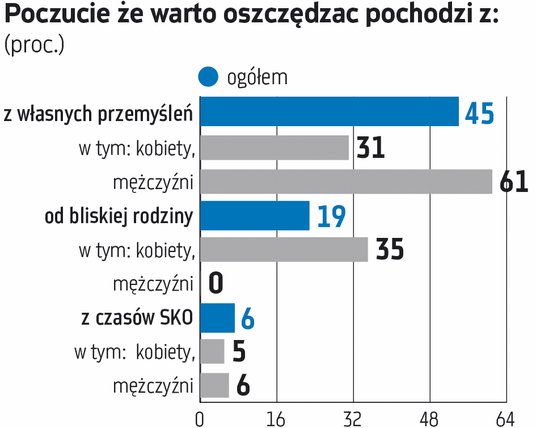 W sumie 73 proc. osób mniej lub bardziej regularnie gromadzi pieniądze na przyszłość, najczęściej nie więcej niż 1000 zł miesięcznie. Spośród grona odkładających środki na przyszłość, aż 45 proc. mówi, że samodzielnie doszło do wniosku, że warto oszczędzać – wynika z badania Velobanku. W tym gronie dominują mężczyźni (61 proc.), mniej niż jedna trzecia kobiet udzieliła podobnej odpowiedzi. Niemal co piąty badany świadomość oszczędzania wyniósł z domu, inspirując się radami najbliższej rodziny. Na rozmowy o finansach prowadzone z bliskimi zdecydowanie bardziej otwarte są panie. Na trzecim miejscu plasuje się inspiracja czasami Szkolnej Kasy Oszczędności. Nawet 6 proc. ankietowanych odkłada pieniądze, jako kontynuację nawyku z czasów szkolnych. Dotyczy to niemal jednakowo kobiet (5 proc.) i mężczyzn (6 proc.).