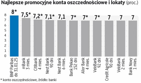 Nic zatem dziwnego, że promocyjne oprocentowania kont oszczędnościowych są teraz wyższe niż lokat. 8 proc. daje BNP Paribas BP, 7,5 proc. mBank, oprócz tego jest jeszcze pięć ofert z oprocentowaniem 7 proc. i wyższym. Tymczasem najlepsza lokata oprocentowana jest w wysokości 7,1 proc., oprócz niej są jeszcze trzy na 7 proc.