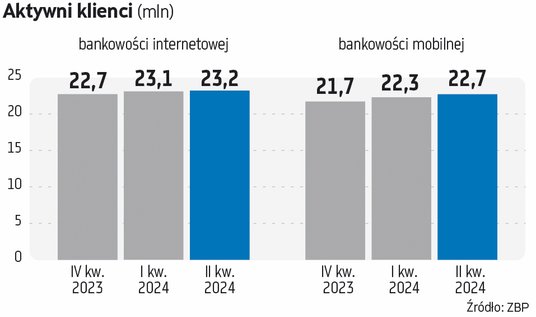 Liczba rachunków klientów indywidualnych z dostępem do bankowości elektronicznej wyniosła w II kwartale 2024 r. ponad 43,5 mln, co stanowi wzrost o 0,5 proc. w porównaniu z poprzednim kwartałem. Ponad 23 mln z tych klientów przynajmniej raz w miesiącu loguje się do e-bankowości – oznacza to wzrost o 0,5 proc. w porównaniu z I kwartałem 2024 r.
