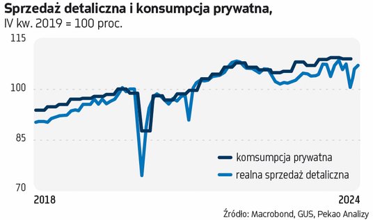 Sprzedaż detaliczna w cenach stałych w listopadzie 2024 r. wzrosła o 3,1 proc. rok do roku, co przewyższyło prognozy analityków. W cenach bieżących wzrost wyniósł 3,4 proc. W ujęciu miesięcznym sprzedaż spadła o 1,2 proc. w porównaniu z październikiem. Wśród kategorii największy wzrost odnotowano w sprzedaży pojazdów samochodowych, motocykli i części (o 28,1 proc.) oraz w grupie „pozostałe” (o 14,8 proc.). Sprzedaż przez internet zmniejszyła się o 6 proc. r./r., a jej udział w sprzedaży ogółem spadł z 11,7 proc. do 10,7 proc.
