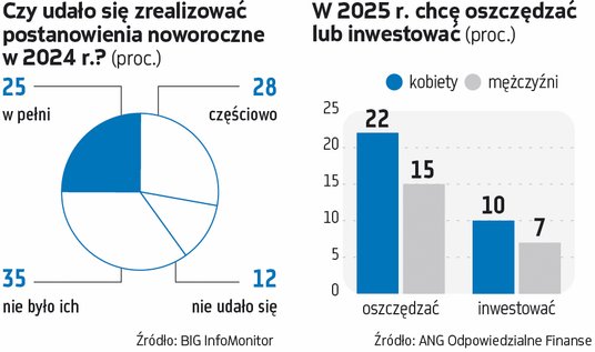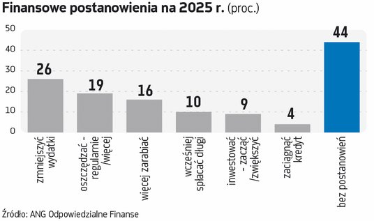 19 proc. Polek i Polaków planuje budować oszczędności w formie odkładania nadwyżek finansowych na rachunku, lokacie czy nawet „w skarpecie”. Kolejne 9 proc. myśli o inwestowaniu w 2025 r. – Tu prym wiodą panie. Zacząć regularnie oszczędzać lub zwiększyć odkładaną kwotę chce 22 proc. kobiet i tylko 15 proc. mężczyzn. O inwestowaniu w akcje, obligacje czy inne produkty inwestycyjne myśli kolejne 10 proc. kobiet i 7 proc. mężczyzn – mówi Natalia Ciecióra, menedżerka działu marketingu w ANG Odpowiedzialne Finanse, firmy pośrednictwa finansowo-ubezpieczeniowego.