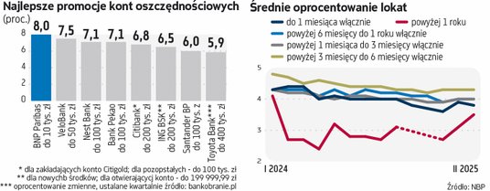 Konta oszczędnościowe przyciągają zarówno promocyjnymi oprocentowaniami, jak i możliwością skorzystania ze zgromadzonych środków bez utraty oprocentowania. Aktualny promocyjny rekord to 8 proc. od banku BNP Paribas. Oferta dostępna jest do 30 września, ale nie powala na kolana: dotyczy jedynie salda do 10 tys. zł. Aby skorzystać z nieco gorzej oprocentowanych ofert, ale za to ze znacznie wyższymi limitami, trzeba się spieszyć. Sporo kończy się w maju, kiedy to prawdopodobnie Rada Polityki Pieniężnej obniży stopy procentowe. Promocje na pewno powrócą. Ze znacznie niższymi oprocentowaniami.