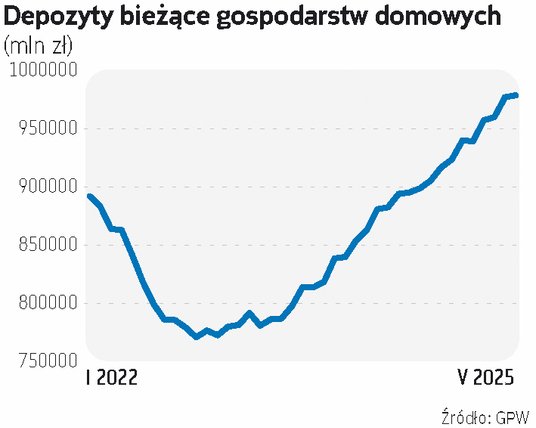 I tak było. Jak podał NBP, w maju wartość depozytów i innych zobowiązań w sektorze gospodarstw domowych wzrosła o 2,8 mld zł, tj. 0,2 proc., do 1375,2 mld zł. Zadłużenie gospodarstw domowych wzrosło o 3,2 mld zł, tj. 0,4 proc., do 808,9 mld zł. Depozyty bieżące wzrosły zaledwie o nieco ponad 1,6 mld zł, terminowe po kwietniowym spadku zwiększyły się o 1,2 mld zł.