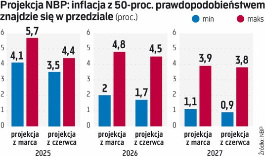 Jak przypominają ekonomiści PKO BP, inflacja CPI w czerwcu wyniosła 4,1 proc. r/r wobec 4,0 proc. r/r w maju. – Był to wynik wyższy od oczekiwań rynkowych (4,0 proc. r/r), ale zgodny z naszą prognozą – stwierdzili. – Zarówno czerwcowa zmiana cen żywności (+0,1 proc. m/m), jak i paliw (-1,3 proc. m/m) były niższa od naszych prognoz. W danych zaskakuje spadek cen paliw – mimo istotnego wzrostu ich cen pod koniec miesiąca. Oznacza to, że w czerwcu prawdopodobnie wzrosła inflacja bazowa – do 3,4 proc. r/r z 3,3 proc. r/r w maju. Jednocześnie czerwiec był ostatnim miesiącem z podwyższoną inflacją – w lipcu inflacja CPI obniży się poniżej 3 proc. r/r i według nas pozostanie w przedziale 2-3 proc. r/r do końca 2026 – przewidują.