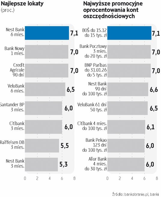 W przypadku lokat jest jeszcze jednak oferta z oprocentowaniem 7 proc. Kont oszczędnościowych z takim promocyjnym oprocentowaniem jest tyle samo. Na najwyższym stopniu podium jest BOŚ Bank z 7,1 proc. na Rachunku Cyfrowy Zysk – oczywiście dla nowych klientów, ale tylko do 15 grudnia i do salda 15 tys. zł. Są jeszcze dwie oferty po 7 proc. – Banku Pocztowego i BNP Paribas – dłuższe, ale z saldem odpowiednio 15 tys. zł i zaledwie 5 tys. zł.