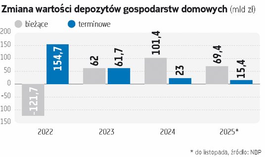W listopadzie wartość depozytów i innych zobowiązań banków wobec sektora gospodarstw domowych wzrosła o 8,5 mld zł, tj. 0,6 proc., do 1 410,6 mld zł – wynika z danych NBP. Ale uwaga: tylko za sprawą depozytów bieżących, które zwiększyły się o niemal 9,4 mld zł. Depozytów terminowych ubyło nieco ponad 860 mln zł. Podobnie może wyglądać grudzień. A jak było w całym roku 2025?