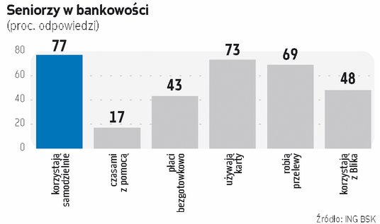Ankietowani seniorzy coraz pewniej poruszają się w świecie bankowości elektronicznej. Aż 77 proc. twierdzi, że korzysta z niej całkowicie samodzielnie, a kolejne 17 proc. jedynie sporadycznie prosi o pomoc bliskich. Wśród seniorów na popularności zyskują bezgotówkowe formy płatności. Jeszcze w 2025 r. gotówkę preferowało 76 proc. badanych – dziś tą formę płatności regularnie wybiera 60 proc. respondentów. Seniorzy chętniej wybierają kartę płatniczą (73 proc.), a 69 proc. z nich stawia na przelewy internetowe. Dynamicznie rośnie także znaczenie BLIK-a, z którego korzysta już 48 proc. badanych – to wzrost o 3 punkty procentowe względem wyników sprzed roku.
